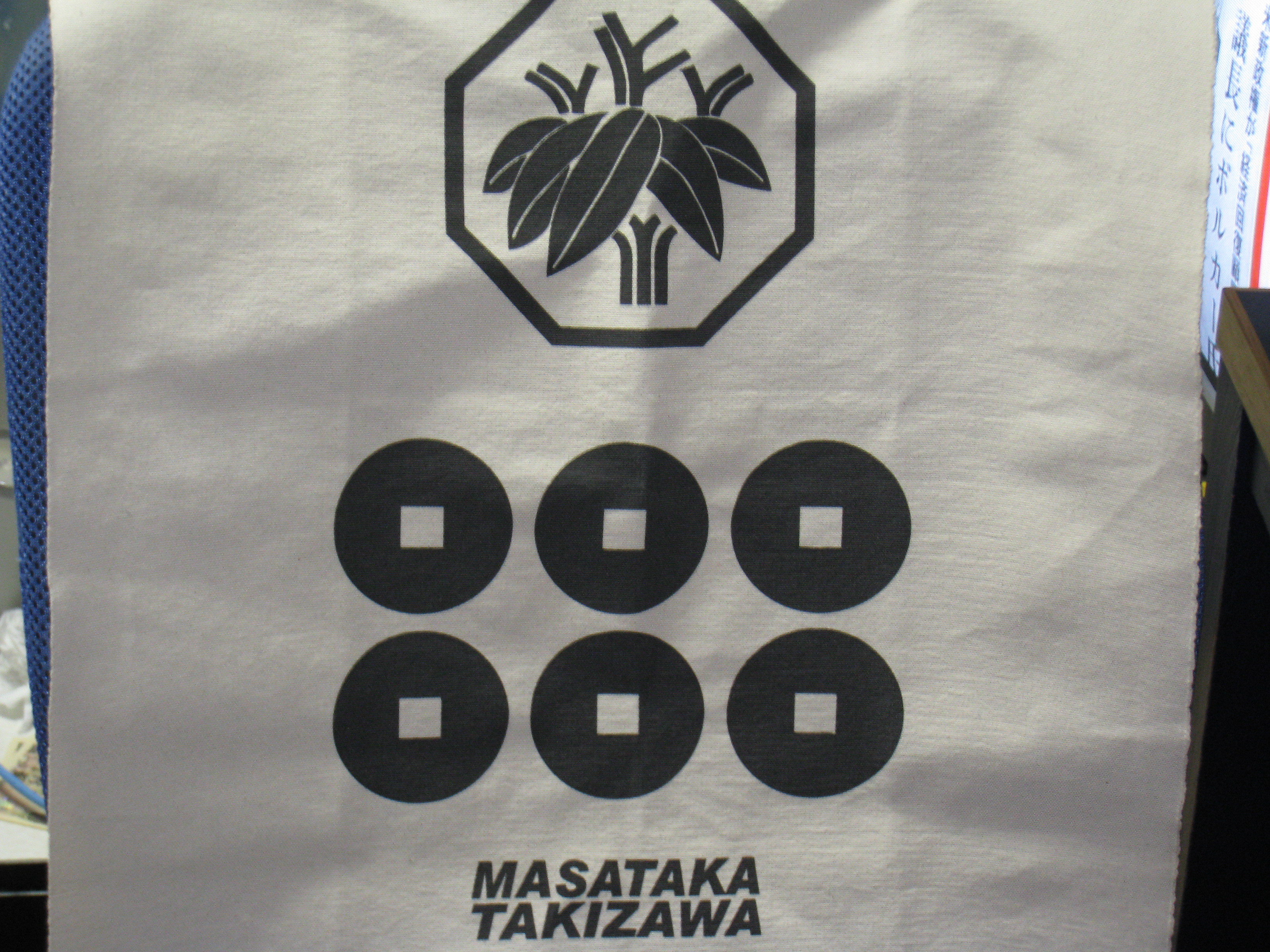 真田幸村を尊敬しているので、真田の六文銭と自分の家の家紋の変わり根笹を入れました。